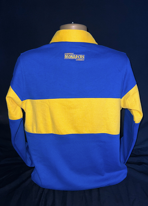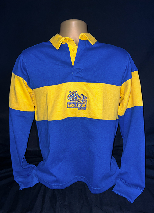 This official long sleeve rugby shirt features bold blue and yellow hoops, finished with an embroidered Monarchs crest on the chest and additional branding on the back. Built from a durable, comfortable fabric with a traditional collar and button placket, it’s perfect for cooler race nights or everyday wear.